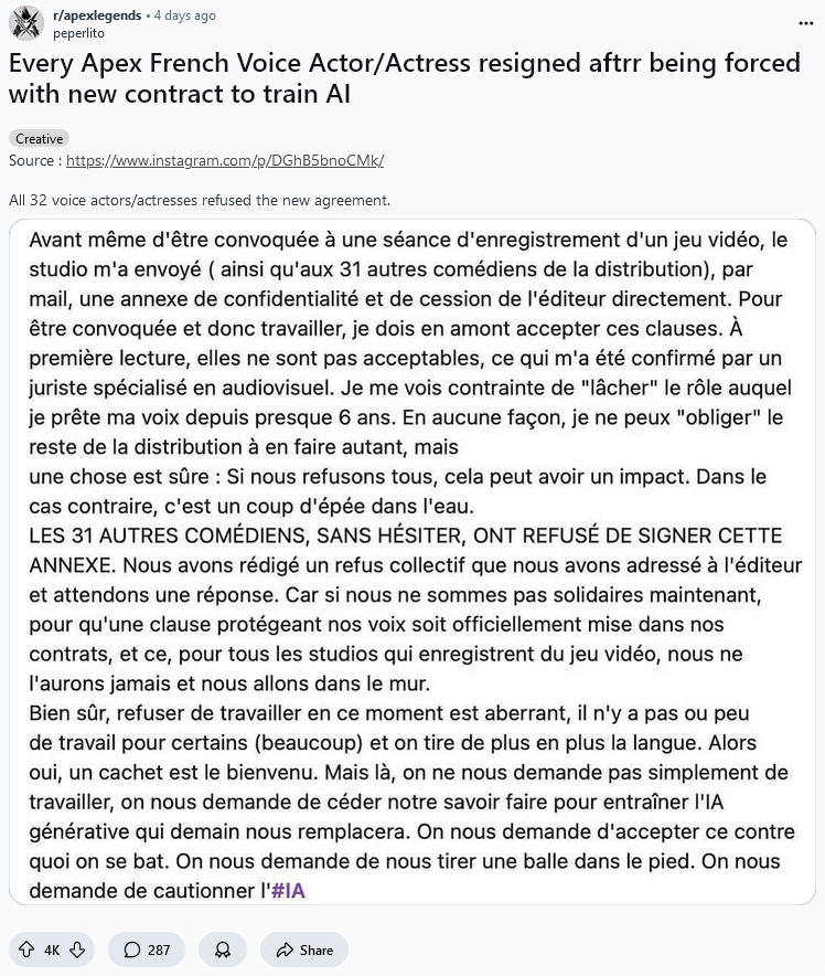 В нем сообщается, что «все французские актёры/актрисы озвучки Apex уволились после того, как их заставили подписать новый контракт на обучение ИИ».